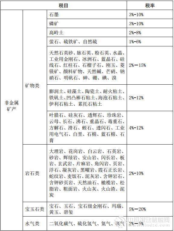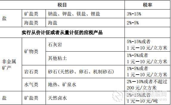 實施資源稅從價計征改革時,財政部、稅務(wù)總局列明了20多種主要礦產(chǎn)品稅目,其他礦產(chǎn)品稅目由省級人民政府確定。為保持稅法的規(guī)范性和嚴(yán)肅性,根據(jù)《中華人民共和國礦產(chǎn)資源法實施細(xì)則》規(guī)定的礦產(chǎn)資源分類細(xì)目,《征求意見稿》所附《資源稅稅目稅率表》統(tǒng)一列明了能源礦產(chǎn)、金屬礦產(chǎn)、非金屬礦產(chǎn)和鹽4大類、146個稅目。對新探明的礦產(chǎn)品,由國務(wù)院提出稅目、稅率建議,報全國人民代表大會常務(wù)委員會決定。其中非金屬礦產(chǎn),礦物類,石灰?guī)r,5%-15%或者1元-10元/立方米;非金屬礦產(chǎn),巖石類,砂石(天然砂、卵石、機制砂石),1%-5%或者1元-10元/立方米。